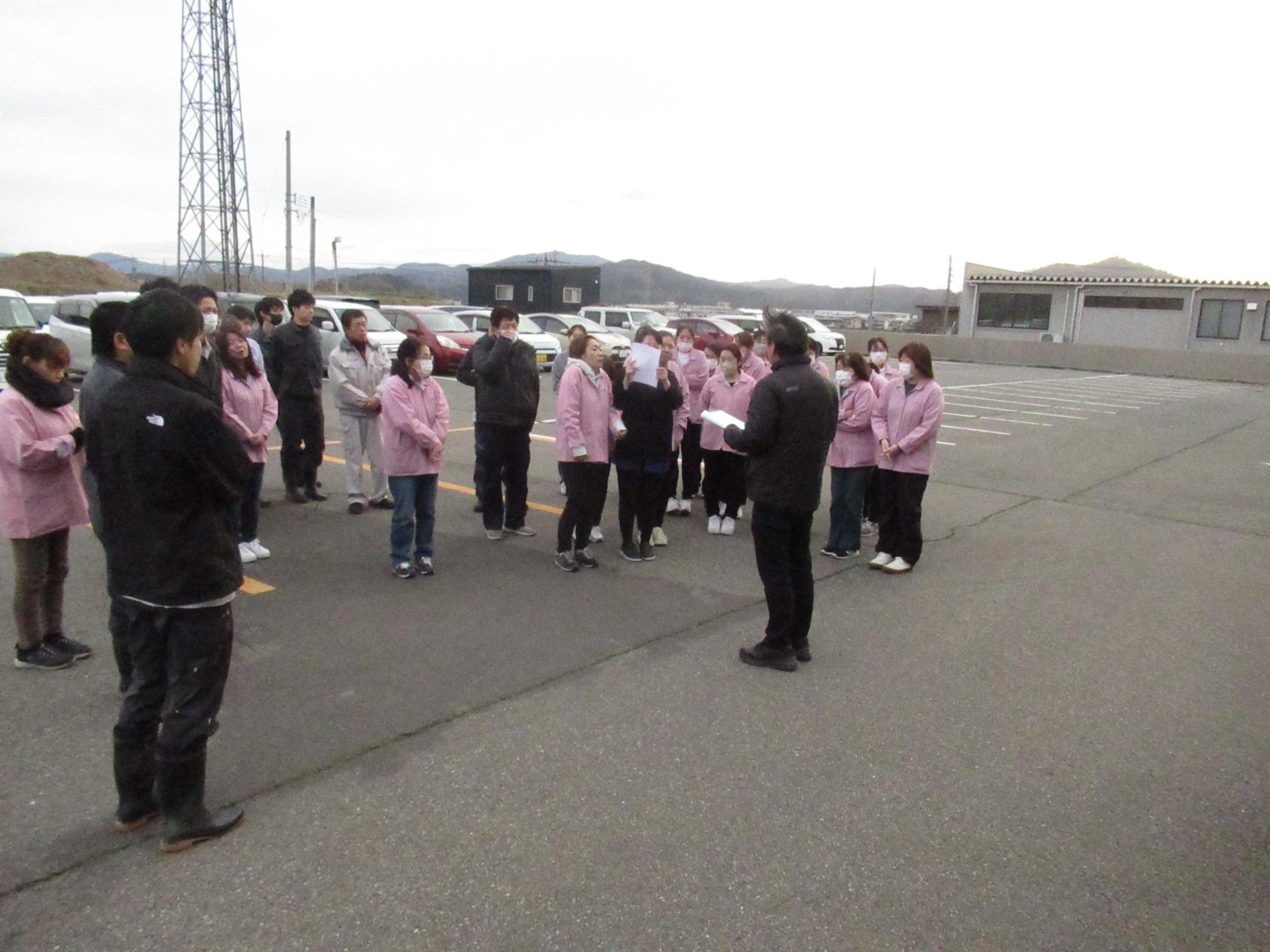 避難場所(駐車場)に於いての集合写真